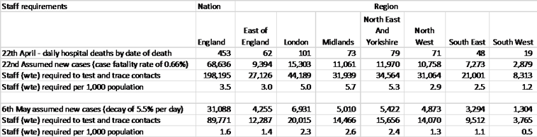 Table 1 – Personnel required to test and trace contacts by English region