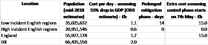 The cost of the lockdown from 23 March to 7 May will be about £92 billion. The lockdown could have been eased 14 days earlier in the low incident regions if they had taken control of the epidemic then. This would have saved £15 billion of the lockdown cost (Table 2). Each day the lockdown continues past 7 May will cost an additional £1.7 billion.