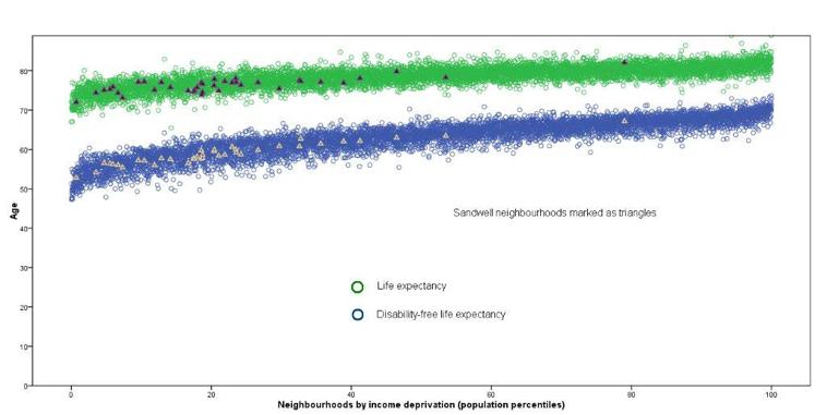 Figure 2: Life expectancy and disability-free life expectancy at birth, by neighbourhood income level, England and Sandwell 1999-2003