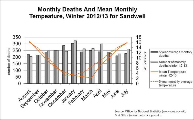Figure 1: monthly death and mean monthly temperature, Winter 2012/13 for Sandwell