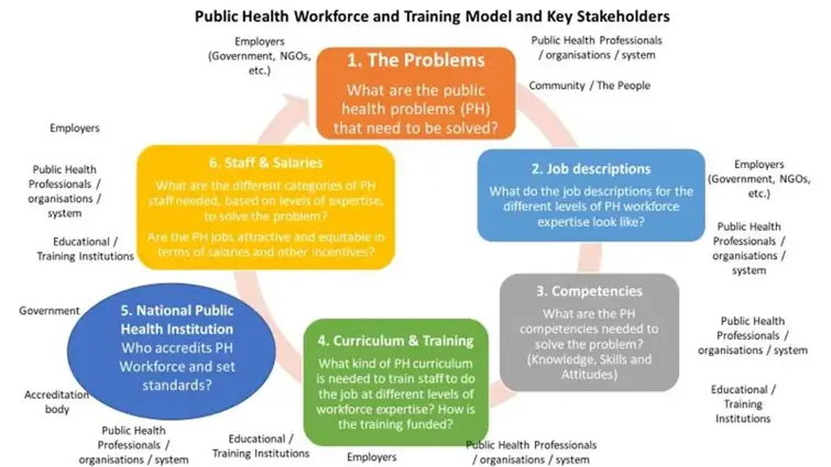 The fundamental question in relation to public health workforce development that needs to be answered is “what are the national public health problems that need to be solved?”. Some of these challenges might vary from one country to another, and even within each country these can vary by regions, districts, provinces, counties, and communities. What is the commitment of the government to tackle the public health problems in terms of staff training, provision of necessary resources and equipment, salaries of staff, among other things. In order to understand the problems, a number of stakeholders need to be engaged, including public health professionals, the public, government, non-governmental organisations, civil society, etc.