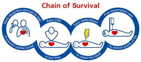 The resus council recognises a Chain of Survival for Cardiac Arrest, which includes: early recognition of cardiac arrest and calling for help, early CPR to buy time and early defibrillation to restart the heart. When each link in this chain is strong, chances of survival can rise to over 50%, but if one part of the chain is delayed this percentage drops dramatically.