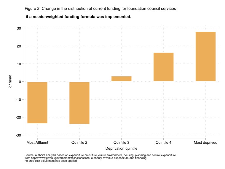 A better estimate of the extent that deprivation predicts need for foundation services would be to use data from 2009 before these cuts were applied. On this basis deprivation explains 40% of the differences in spend per head between councils of these foundation services. In other words we estimate that deprivation is a 10 fold greater driver of need for these foundation services than has been estimated in the government’s consultation document. Figure 2 (below) shows that applying a formula that took into account this difference in need would allocate an additional £28 per head to the most deprived areas and a reduction of £24 per head for the most affluent 20% of local authorities.