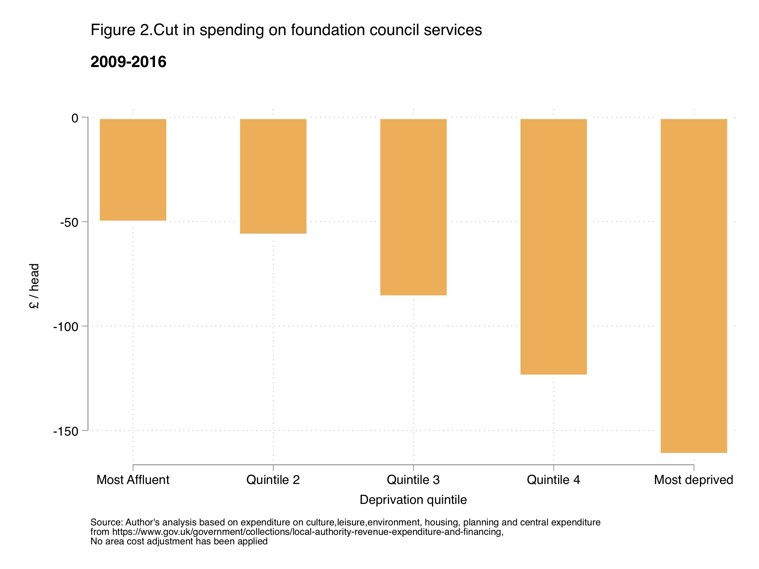 But the consultation erroneously justifies not including socioeconomic deprivation as a measure of need for these foundation services by claiming that it only explains 4% of the variation in historical spend on these services. This is based on a flawed analysis that investigates predictors of total spend, rather than per capita spend, as would be standard practice. In fact, using the correct analysis, socioeconomic deprivation is a very strong determinant of variation in historical per head spend on foundation services. Using 2016 data – we show that social and economic deprivation explains 16% of differences in spending per head on foundation services. Even this is an underestimate of how much deprivation is a driver of need for these services, as the budget has been severely cut during recent years due to the government’s austerity programme. These cuts have been far more severe in deprived areas than in more affluent areas, leading to significant unmet needs in the most deprived areas. Figure 2 shows that since 2009 the poorest councils have lost on average £160 per head for these foundation services, whilst the richest councils have lost £50 per head.