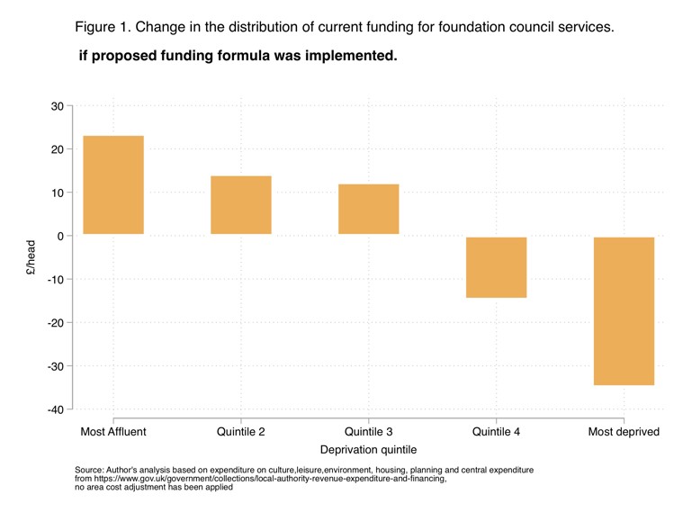 In England there is a long history of allocating local government and NHS resources to local areas based on an objective assessment of their needs. This has led to more resources for these services going to the poorest areas with the greatest needs, which we have shown has resulted in a narrower gap in health between these areas and the rest of the country than would otherwise be the case. The government’s proposals would bring this to an end for these council services. If implemented today, figure 1 shows that the new allocation formula would lead to the most deprived 20% (quintile) of councils losing £35 per head per year – a total of 390 million per year, whilst the most affluent 20% of councils would gain £24 per head – a total of 260 million per year. (Click here for an interactive map showing the impact for each council.)