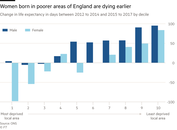 To quote ONS: ‘The gap in life expectancy between the richest and poorest areas of England and Wales has widened during the past decade. Women living in the most deprived parts of England lived an additional half a year less than women in the most affluent parts of the country in 2015 to 2017 compared with 2012 to 2014. The corresponding figure for men was four months. Men in the most deprived areas could expect to die 9.4 years earlier than counterparts in the richest places, while for women the figure was 7.4 years. “We’ve found a large fall in life expectancy at birth among women living in the most deprived areas in England," said Ben Humberstone, deputy director for health analysis and life events at the ONS. “This has led to a significant widening in the inequality in life expectancy at birth in England. Wales mirrored this pattern, although significant changes were not detected," he said.’