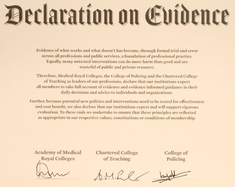 Since evidence has come a long way in the last few decades across all of these policy areas, it seemed to me that a declaration on evidence, signed by the relevant professional bodies, would strengthen a culture of evidence-informed policy and practice in these institutions and in the professional lives of their members and fellows.