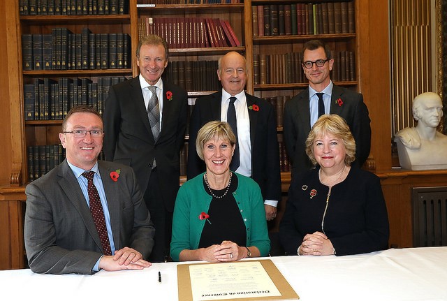 The signing ceremony at the Royal Society. The people featured in the photo, from front to back row, left to right, are: Chief Constable Ian Hopkins (Director, College of Policing), Professor Carrie MacEwen (Chair, Academy of Medical Royal Colleges), Dame Alison Peacock (Chief Executive, Chartered College of Teaching), Lord O’Donnell (Former Cabinet Secretary), Professor Jonathan Shepherd (declaration author), and Jonathan Breckon (Director, Alliance for Useful Evidence).